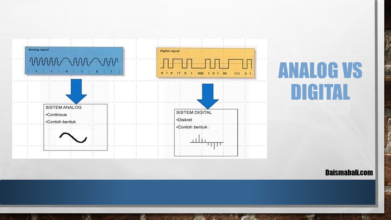 Dari penjelasan antara analag dengan digital dapat disimpulkan bahwa perbedaan utama antara kuantitas analog dengan kuantitas digital adalah bahwa kuntitas analog bersifat kontinyu sedangkan kuantitas digital bersifat diskrit. Karena representasi digital mempunyai sifat yang diskrit maka pada saat membaca harga suatu kuantitas digital tidak ada penafsiran mendua, sedangkan harga dari kuantitas analog sering menimbulkan interpretasi yang berbeda. Berikut gambaran Antara Analog dengan Digital.