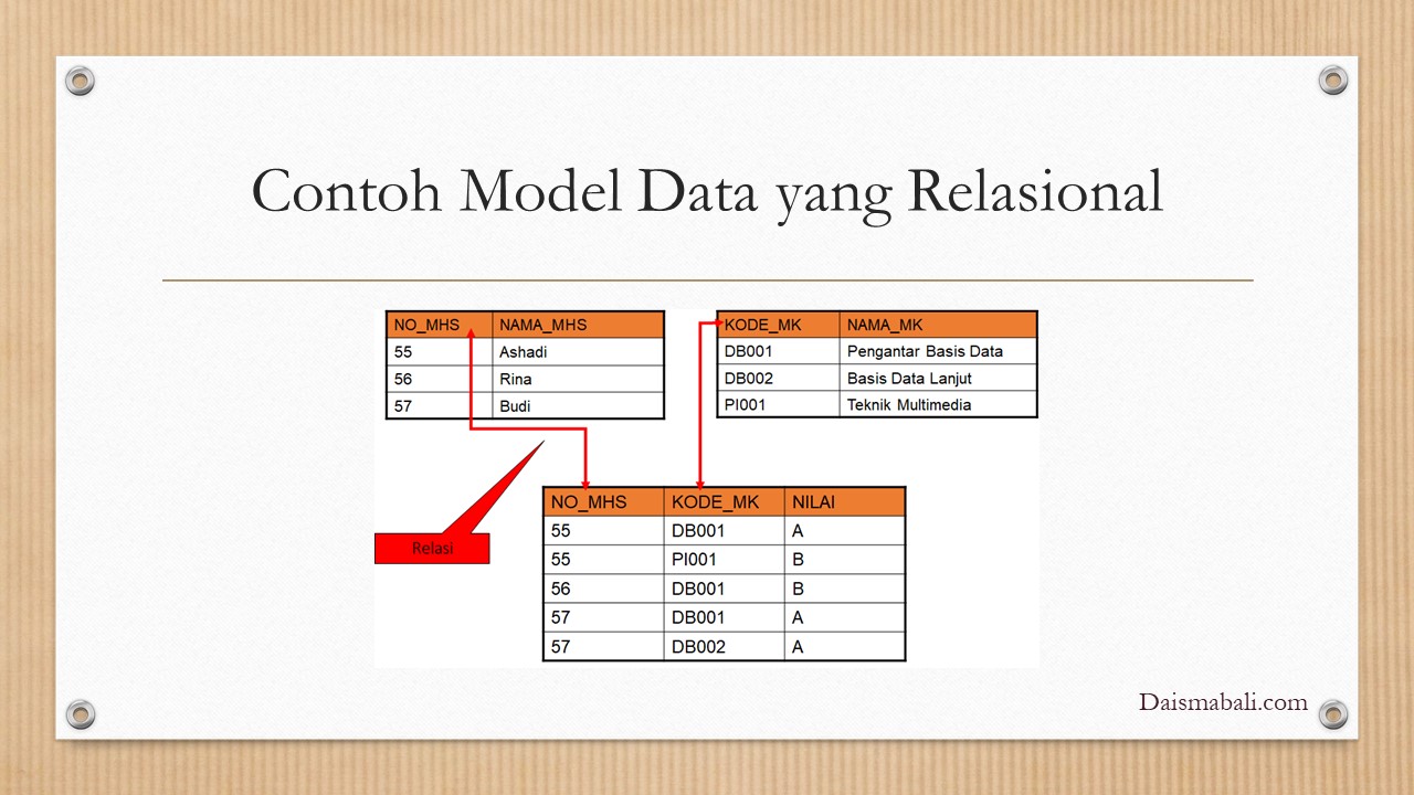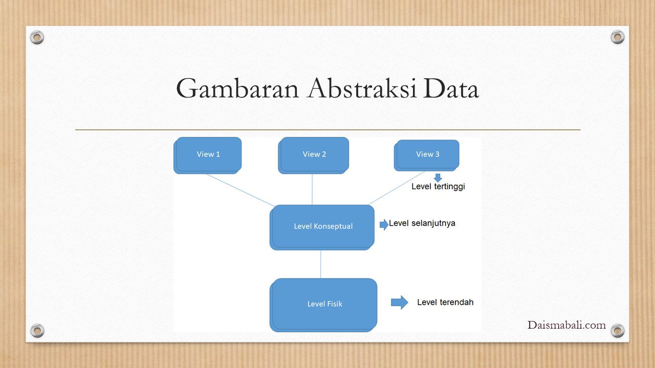 - Level Fisik : level terendah dalam abstraksi data yang menunjukan bagaimana sesungguhnya suatu data tersimpan. Contoh: teks, angka, himpunan