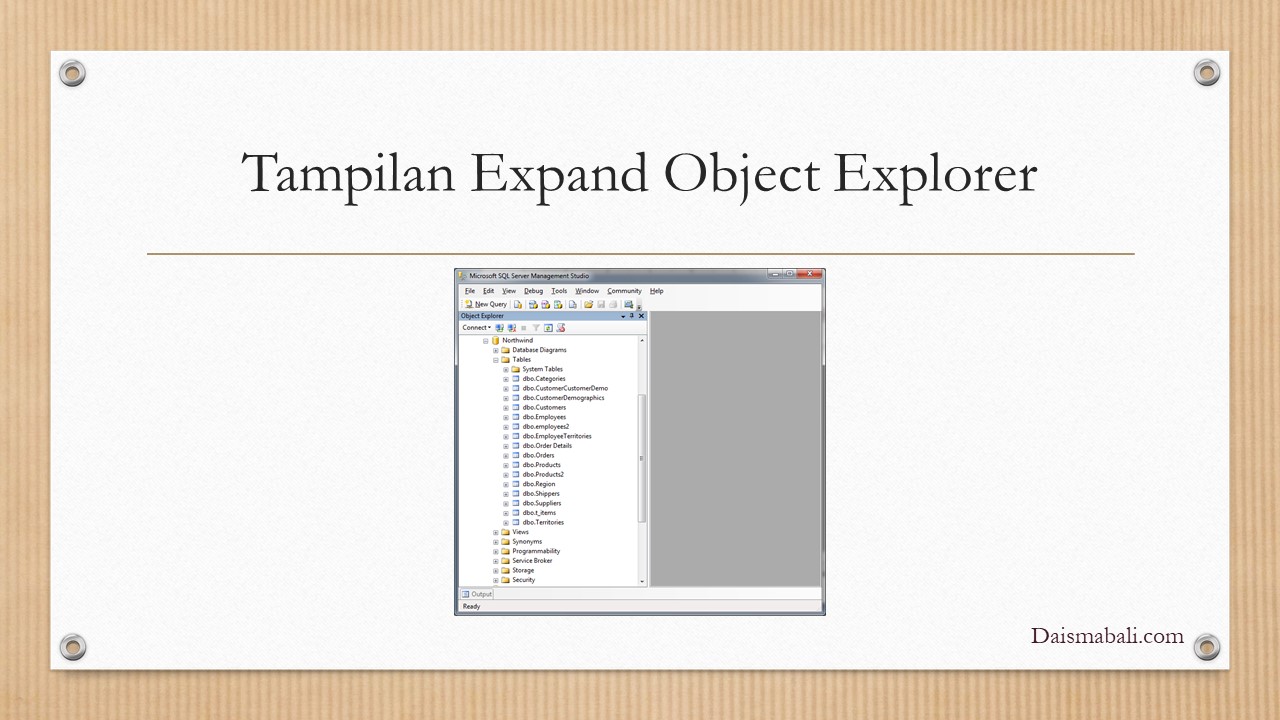 Terdapat Object Explorer berguna untuk menampilkan semua objek – objek yang ada pada instance / server seperti tampilan berikut :