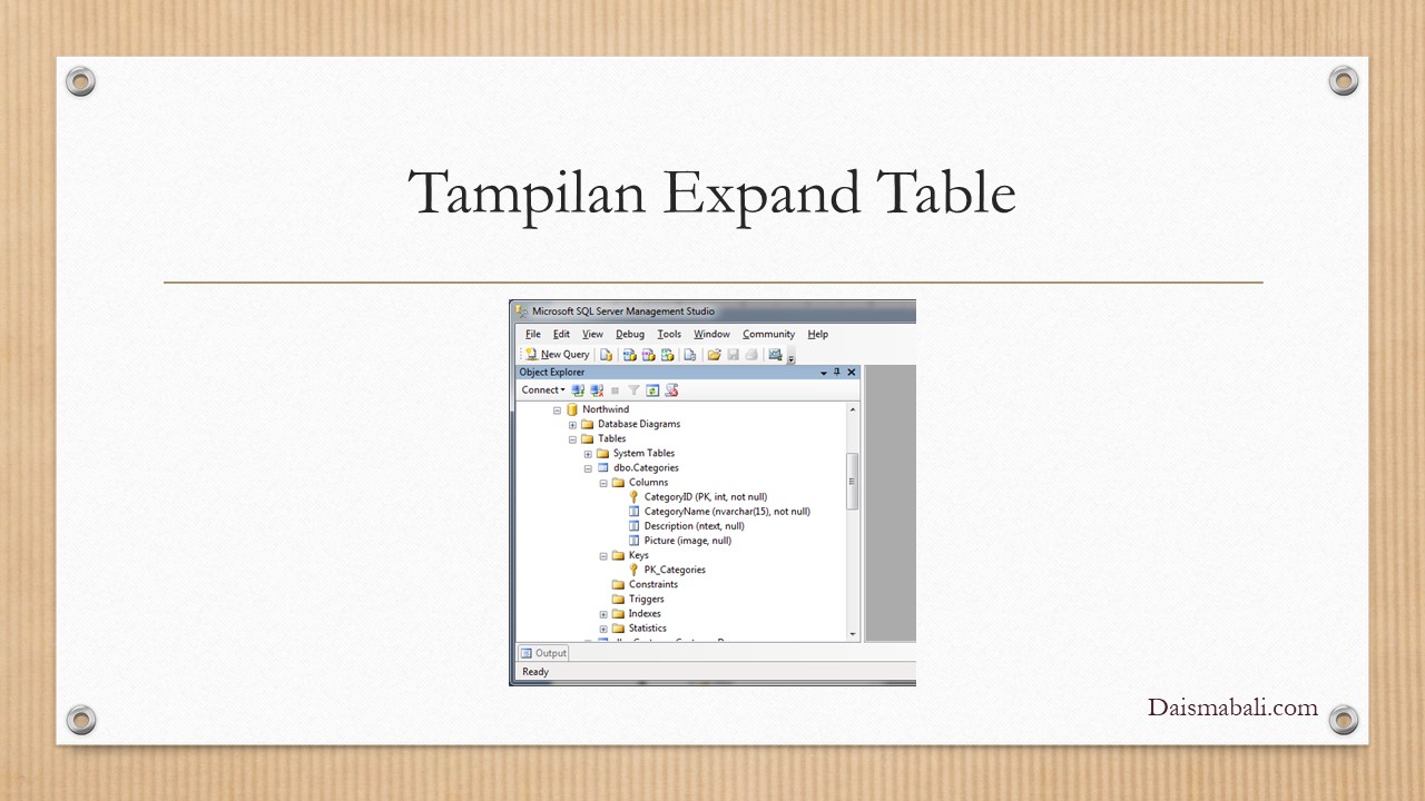Untuk melihat detail dari sebuah tabel cukup melakukan hal yang sama yaitu melakukan expand dengan menekan tanda + pada tabel yang diinginkan. Nanti akan tampil field , tipe data , panjang data dan constraint dari tabel tersebut seperti gambar berikut :