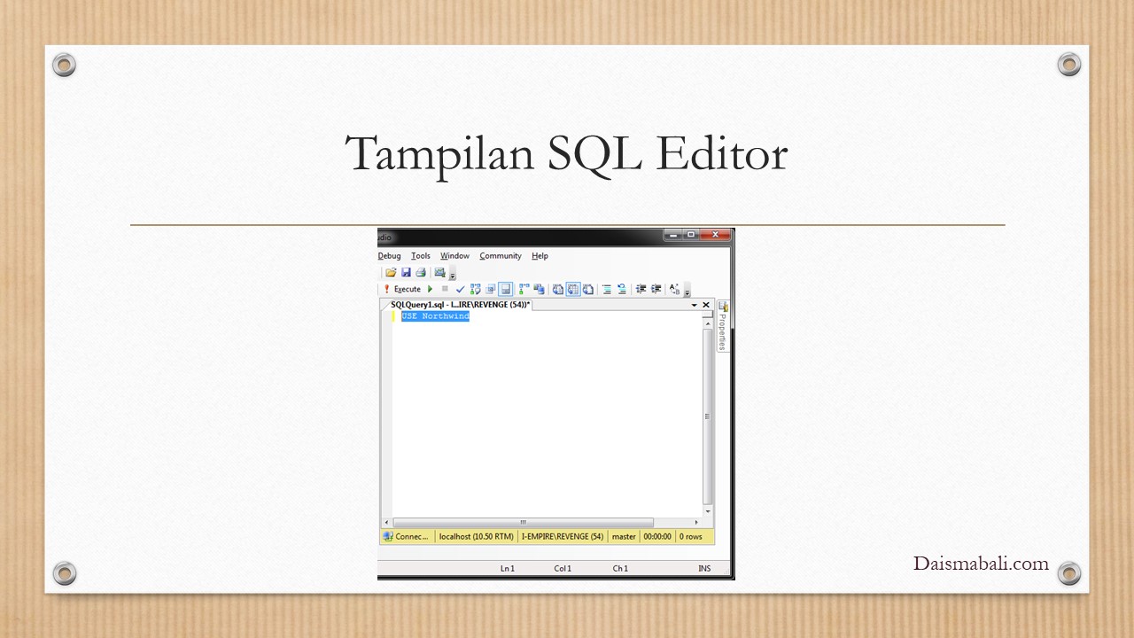 SQL Query Editor digunakan untuk mengetikkan perintah-perintah SQL untuk mengelola database dan objek-objeknya. Dan Untuk mengeksekusi perintah SQL, pilih (block) terlebih dahulu query yang diinginkan, kemudian tekan tombol “!Execute” atau tekan tombol “F5” pada keyboard.