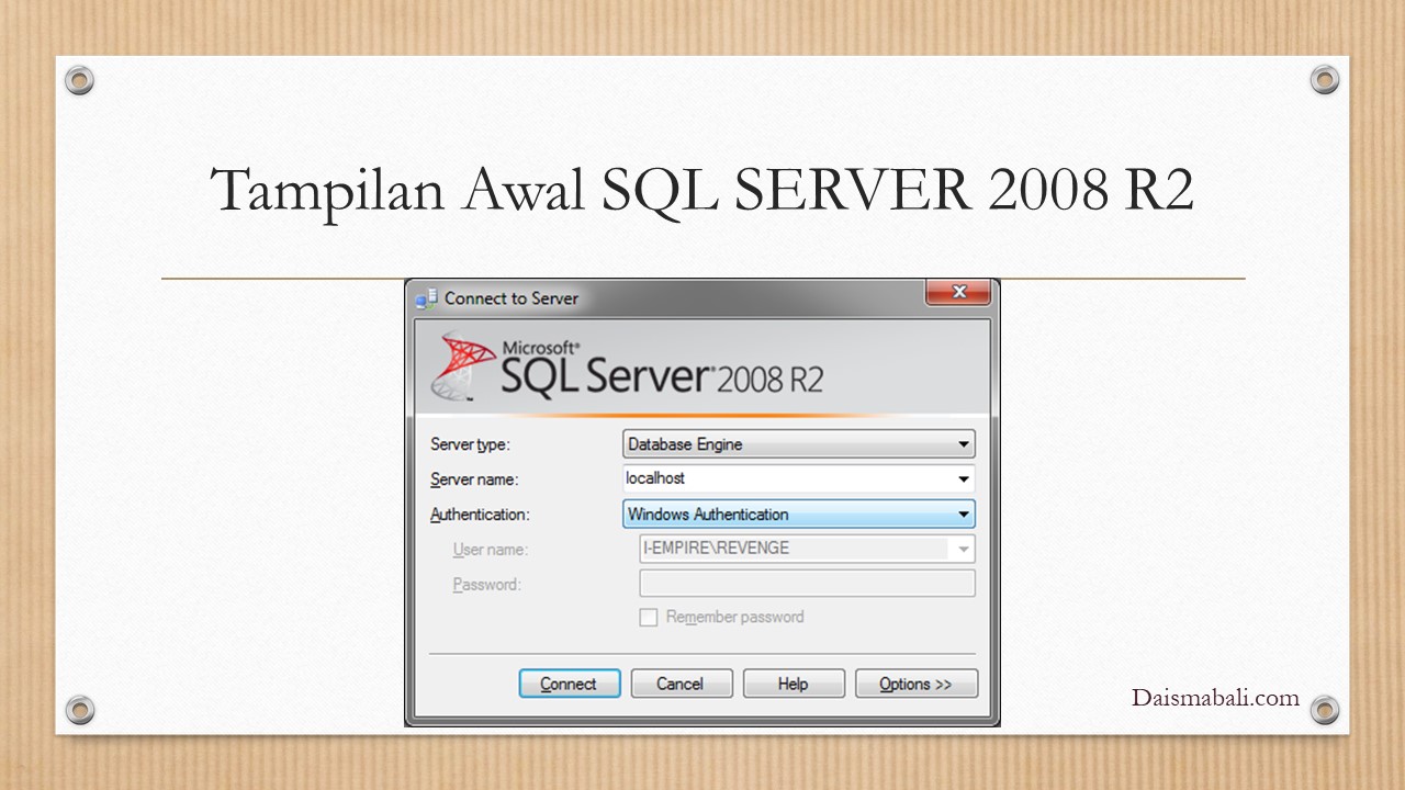 Tampilan ini selalu muncul sebelum dapat mengakses database, jadi anda harus connect ke server melalu halaman sql Server Authentication.