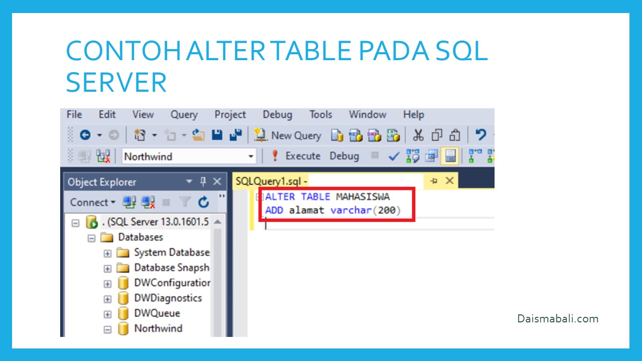 Sebagai salah satu contoh memodifikasi tabel kasusnya ingin menambahkan kolom baru pata Tabel Mahasiswa berupa kolom alamat. Maka Query Sql yang harus dilakukan seperti berikut :