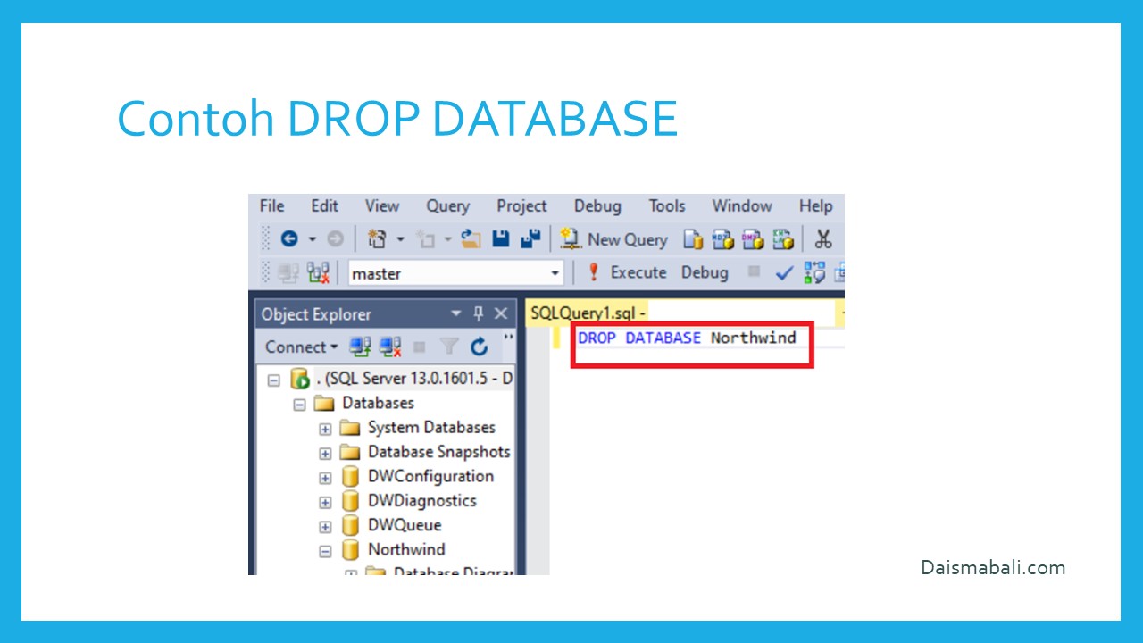 Untuk menghapus Database pastikan Database sedang tidak digunakan. Dan untuk perintah menghapus Database cukup dengan format penulisan :