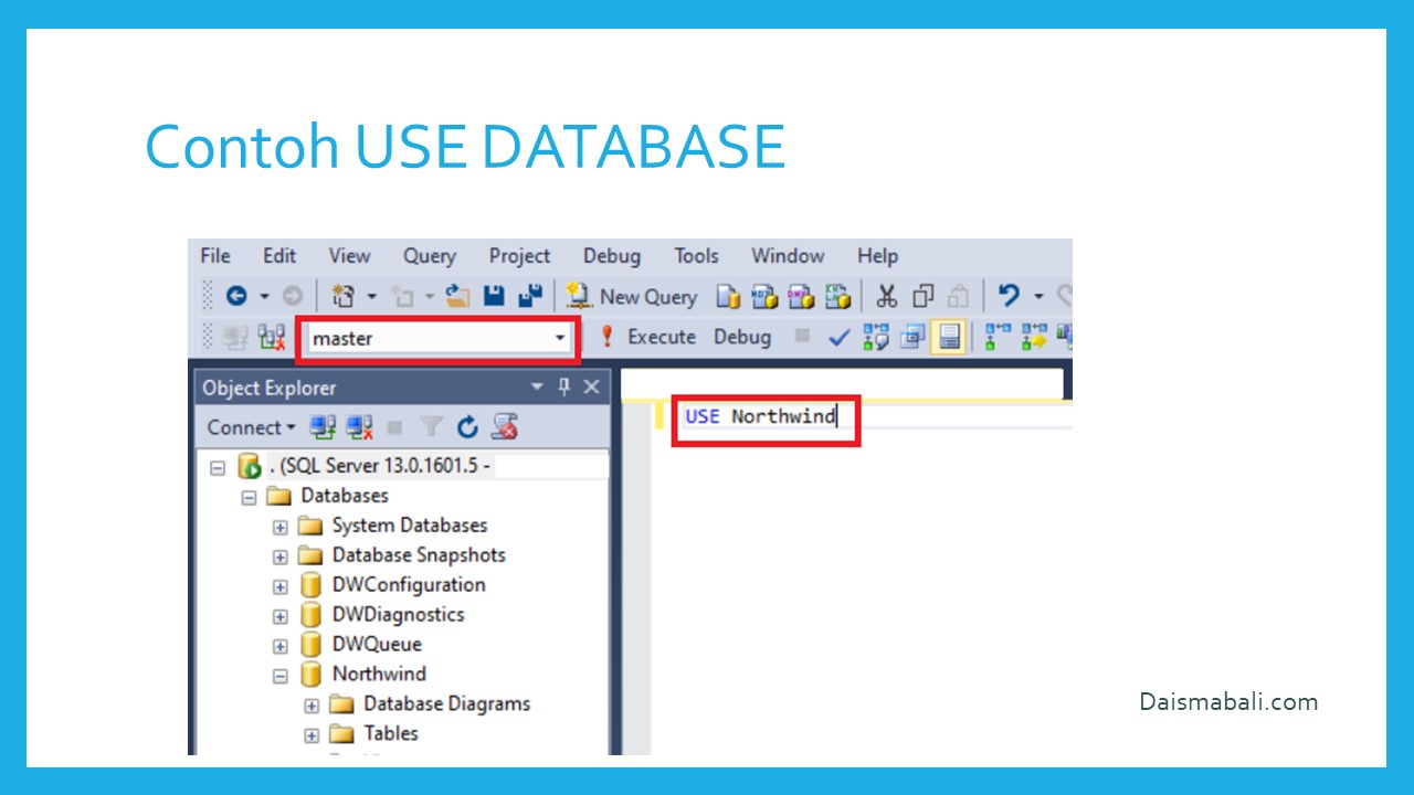 Sebelum melakukan perintah-perintah terhadap sebuah databse, kita harus memilih/mengaktifkan database yang kita inginkan. Caranya bisa dengan mengubah nama database pada combo box “Database” Atau bisa menggunakan perintah: USE [NamaDatabase]. seperti gambar berikut :