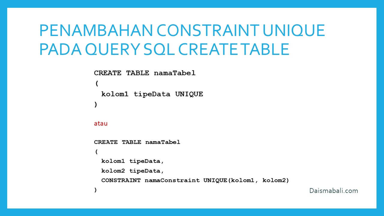 Constraint UNIQUE adalah memastikan semua data pada suatu kolom nilainya berbeda-beda. Berikut penulisan Constraint UNIQUE :
