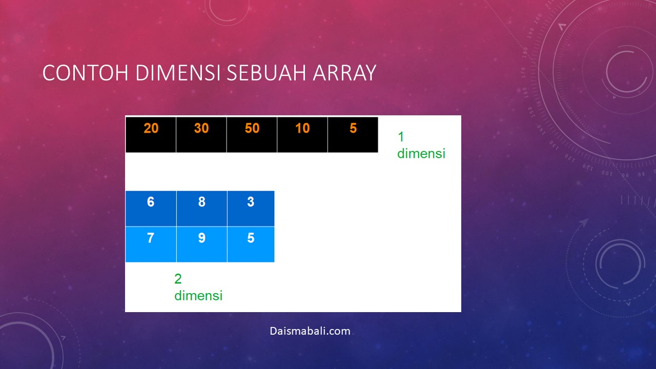 Untuk membuat array berdasarkan dimensinya adapun bentuk penulisannya sebagai contoh berikut :