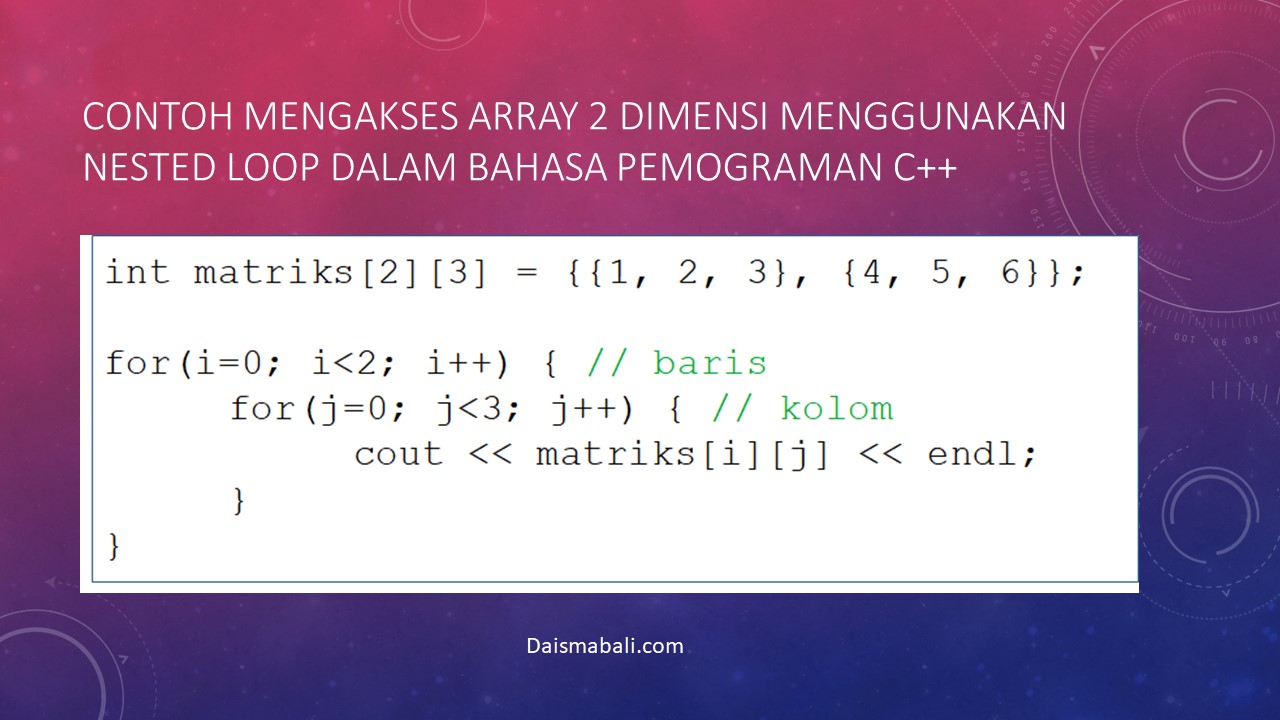 - CONTOH MENGAKSES ARRAY 2 DIMENSI MENGGUNAKAN NESTED LOOP DALAM BAHASA PEMOGRAMAN C++
