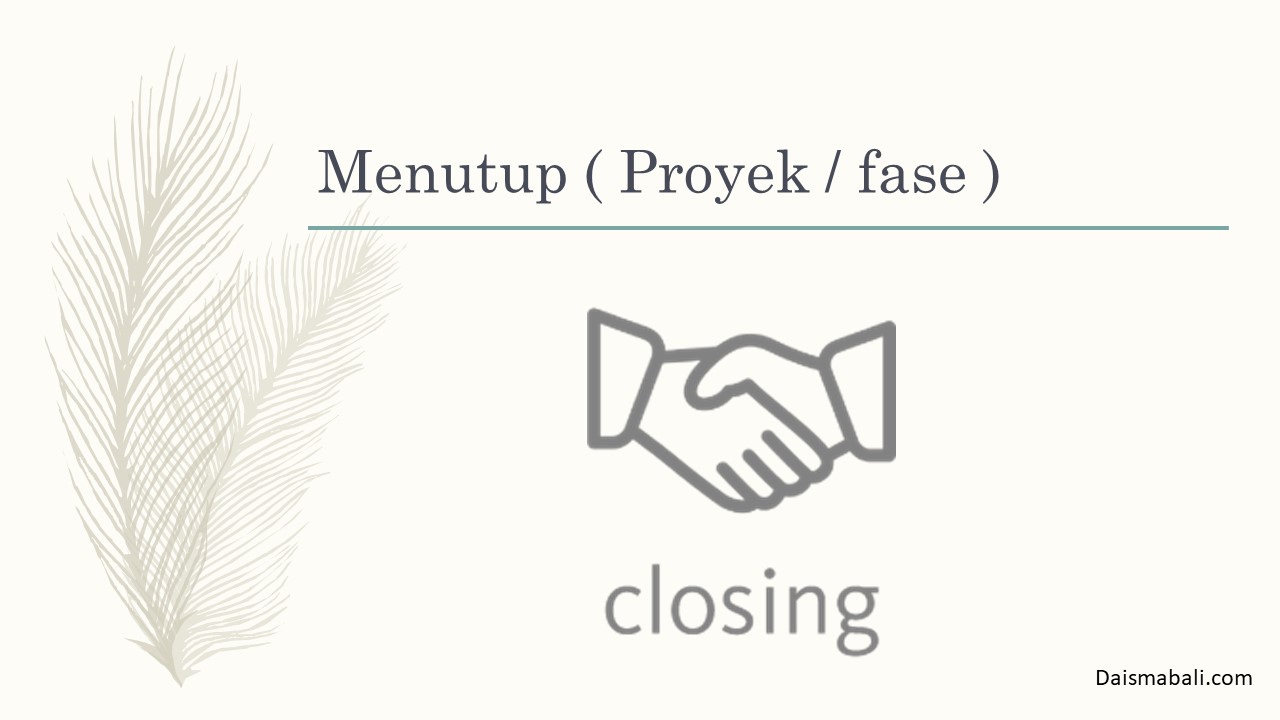 Merupakan proses menyelesaikan semua kegiatan pada semua kelompok proses manajemen proyek untuk secara resmi menyelesaikan proyek atau fase. Untuk menutup sebuah proyek anda harus menyelesaikan semua kegiatan dan transfer semua pekerjaan yang telah diselesaikan atau dibatalkan kepada orang – orang yang tepat. Menutup proyek / fase harus memiliki outpu utama yang meliput :