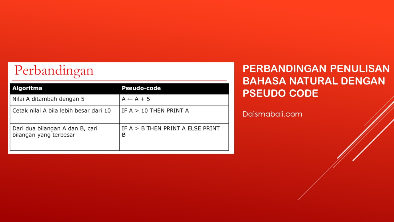 Berikut gambar diatas merupakan perbandingan penulisan Algoritma dengan bahasa natural dengan penulisan algoritma dengan Pseudo Code