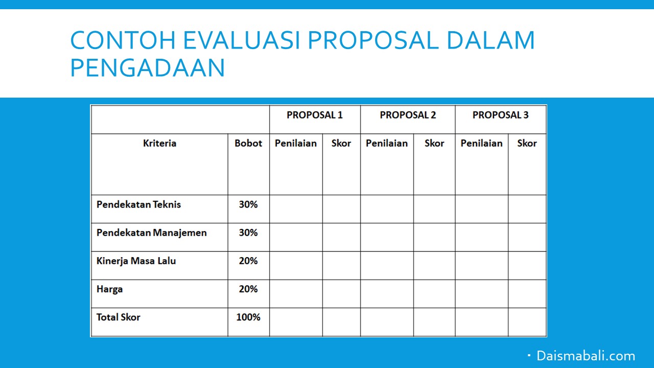 Setelah mendapat Permintaan Untuk Proposal tentu harus dilakukan Kriteria Evaluasi yang sangat penting memahami kriteria evaluasi sebelum mengeluarkan permintaan proposal yang resmi. Dan tentu harus waspada terhadap proposal yang terlihat bagus diatas kertas, silahkan dipastikan untuk mengevaluasi faktor – faktor seperti kinerja masa lalu dan pendekatan manajemen. Selain itu dapat juga memerlukan presentasi teknis sebagai bagian dari proposal. Berikut contoh Evaluasi Proposal dalam Pengadaan :