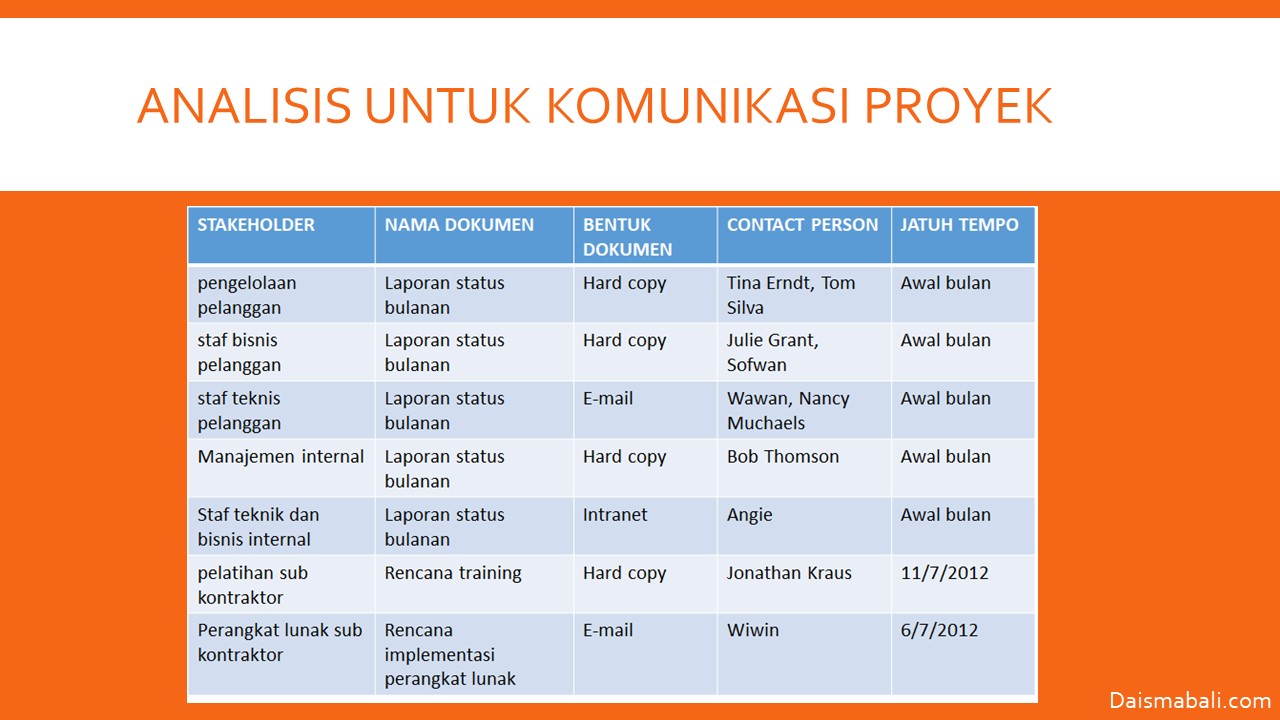 Merupakan proses menentukan kebutuhan informasi stakeholder proyek dan menentukan sebuah pendekatan komunikasi. Adapun proses analisis untuk komunikasi Proyek dalam sebuah tabel seperti berikut :