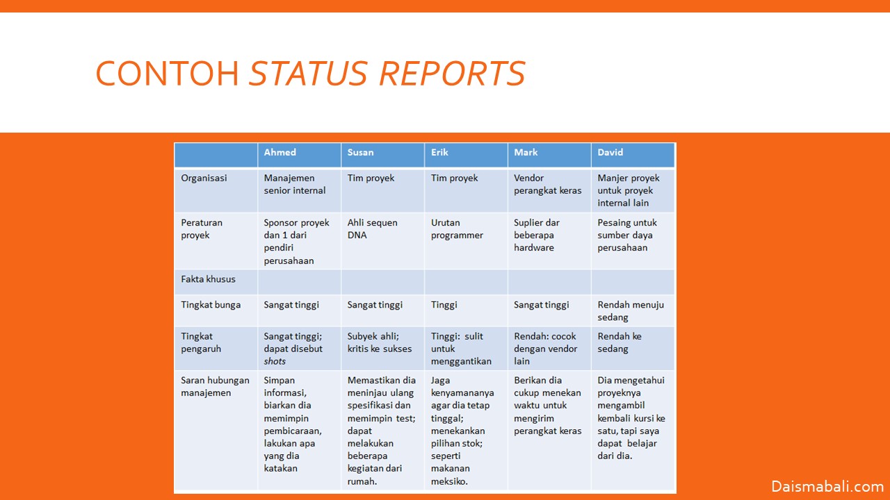 - Status reports yang mendeskripsikan posisi atau perkembangan proyek pada suatu waktu tertentu.