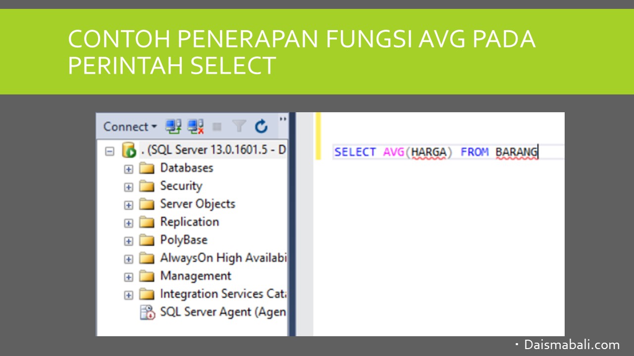 Fungsi Average pada Perintah SELECT yaitu fungsi untuk mencari rata – rata suatu field / kolom. Dengan format penulisan SELECT AVG(nama_kolom) FROM nama_tabel. Jika diimplementasikan dalam SQL seperti tampilan berikut :