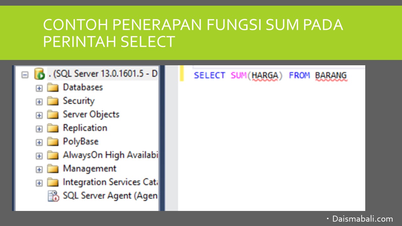 Fungsi Summary pada Perintah SELECT yaitu fungsi untuk mencari penjumlahan dari suatu kelompok data. Dengan format penulisan SELECT SUM(nama_kolom) FROM nama_tabel. Jika diimplementasikan dalam SQL seperti tampilan berikut :