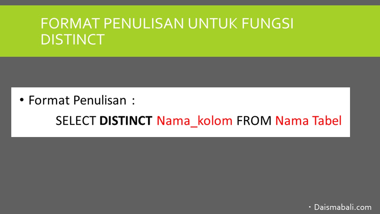 Fungsi Distinct yaitu berguna untuk menghilangkan nilai ganda sehingga membuatnya menjadi nilai tunggal dengan mengeliminasi data yang sama adapun Format Penulisan untuk Fungsi DISTINCT seperti berikut :