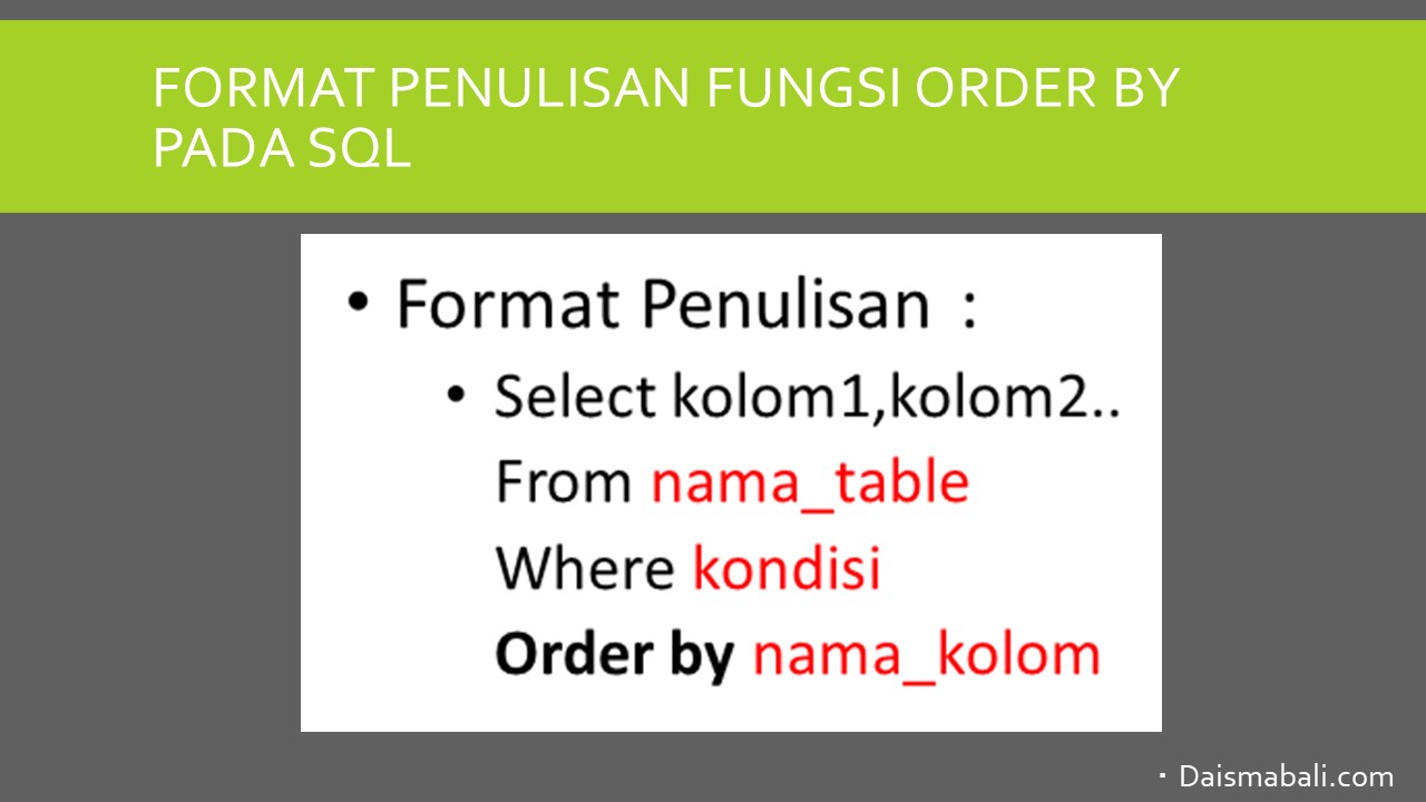 Merupakan fungsi untuk menampilkan data secara berurutan berdasarkan kolom tertentu dalam MS SQL Server biasanya digunakan Perintah Order By. Berikut format penulisan fungsi Order By pada SQL :