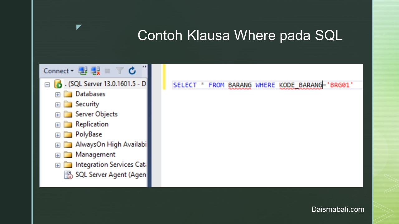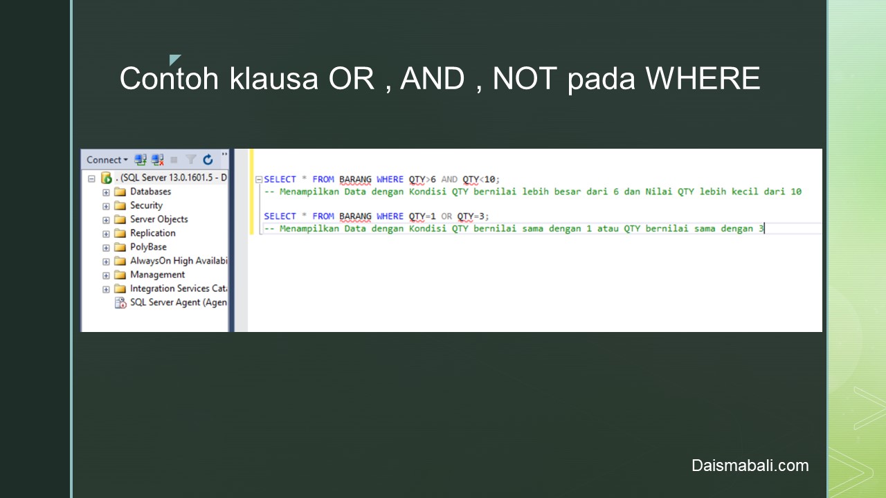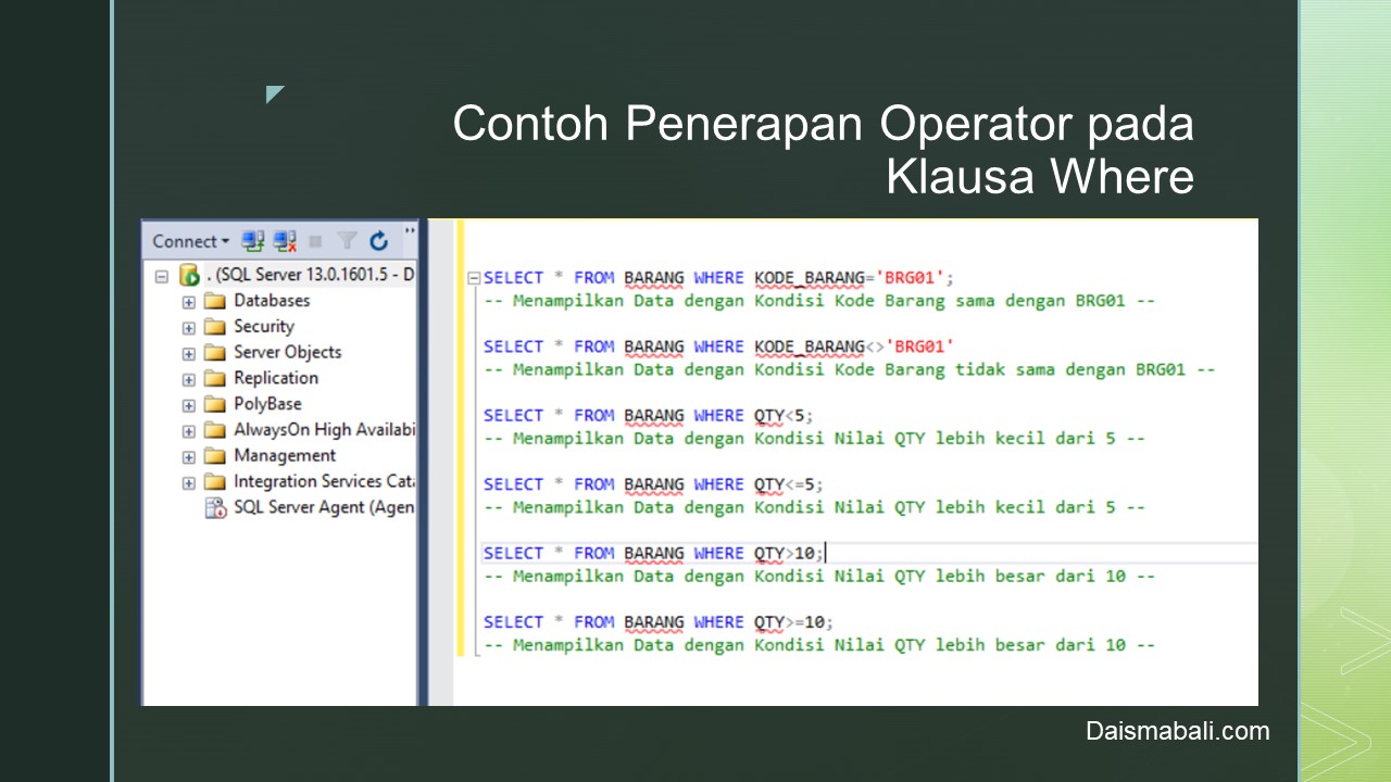 Jika Diterapkan pada Ms. SQL Server untuk Operator pada Klausa Where seperti tampilan berikut :