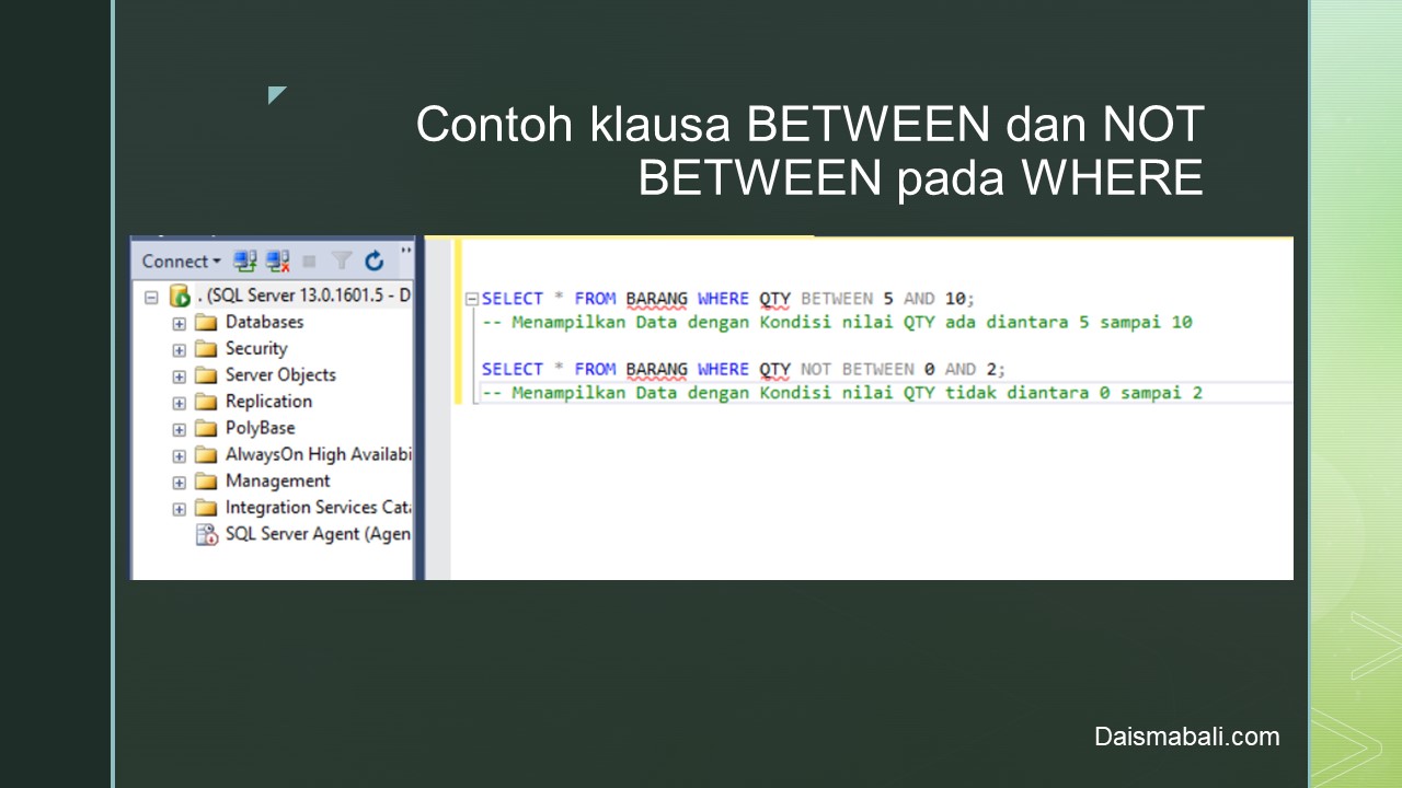 Jika diimplementasikan pada MS.SQL SERVER untuk klausa BETWEEN dan NOT BETWEEN seperti berikut :