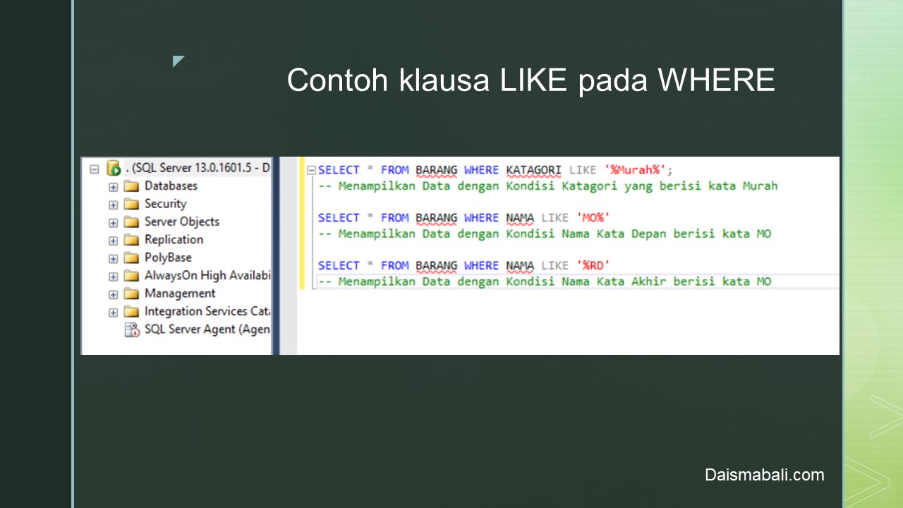 - Contoh klausa LIKE pada WHERE