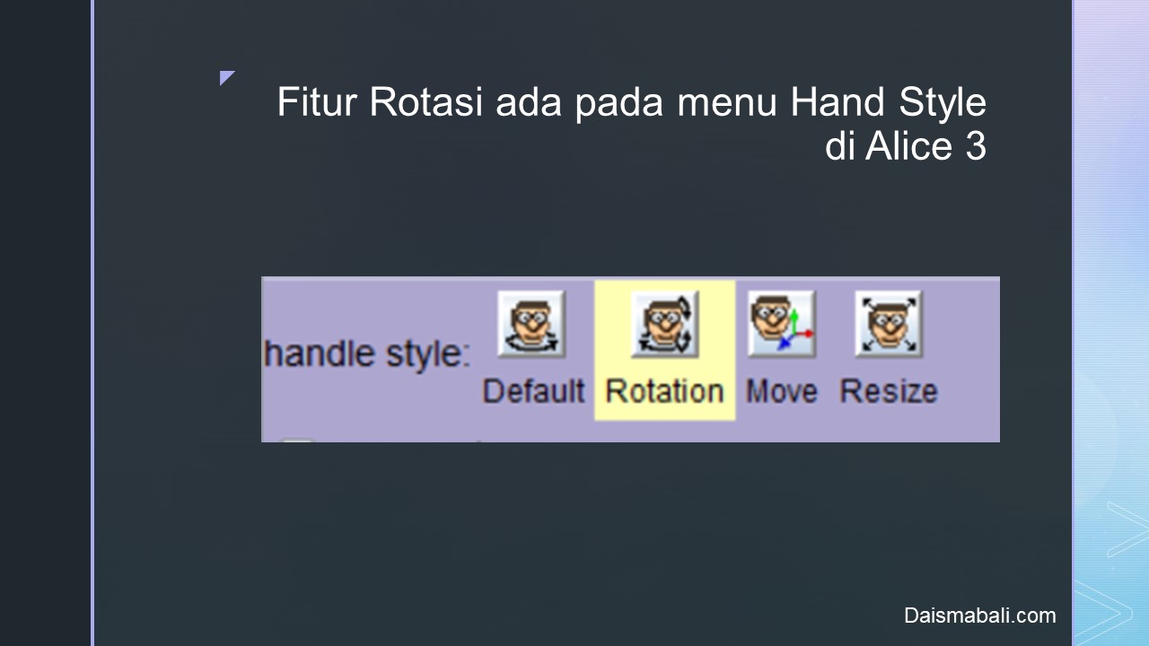 - Fitur Rotasi ada pada menu Hand Style di Alice 3