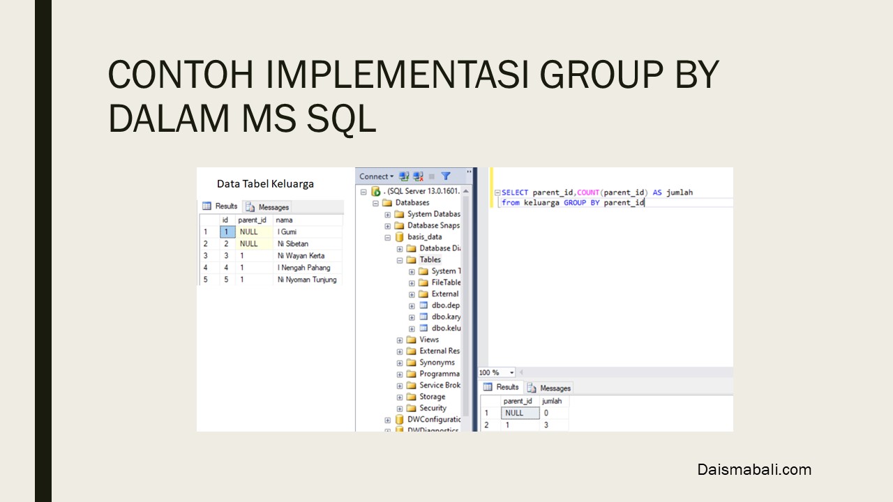 Jika diimplementasikan Penggunaan Group BY pada SQL SERVER maka seperti contoh berikut :