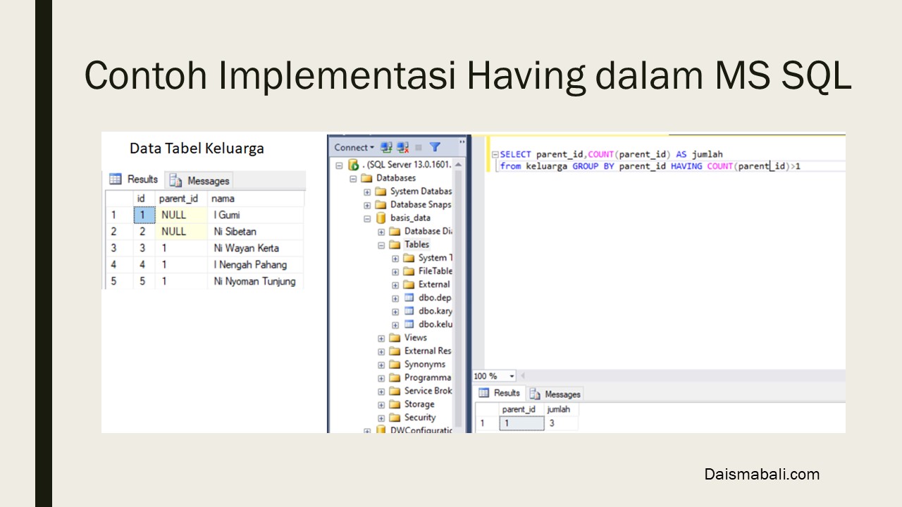 Jadi Having lebih Identik dengan klausa WHERE yang Digunakan untuk membatasi jumlah /memilih baris yang tampil. Pada Klausa WHERE digunakan pada operasi Single-row sedangkan Klausa HAVING digunakan pada operasi Multi-row