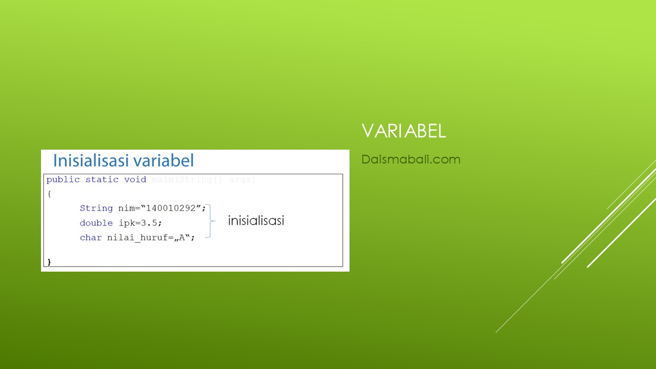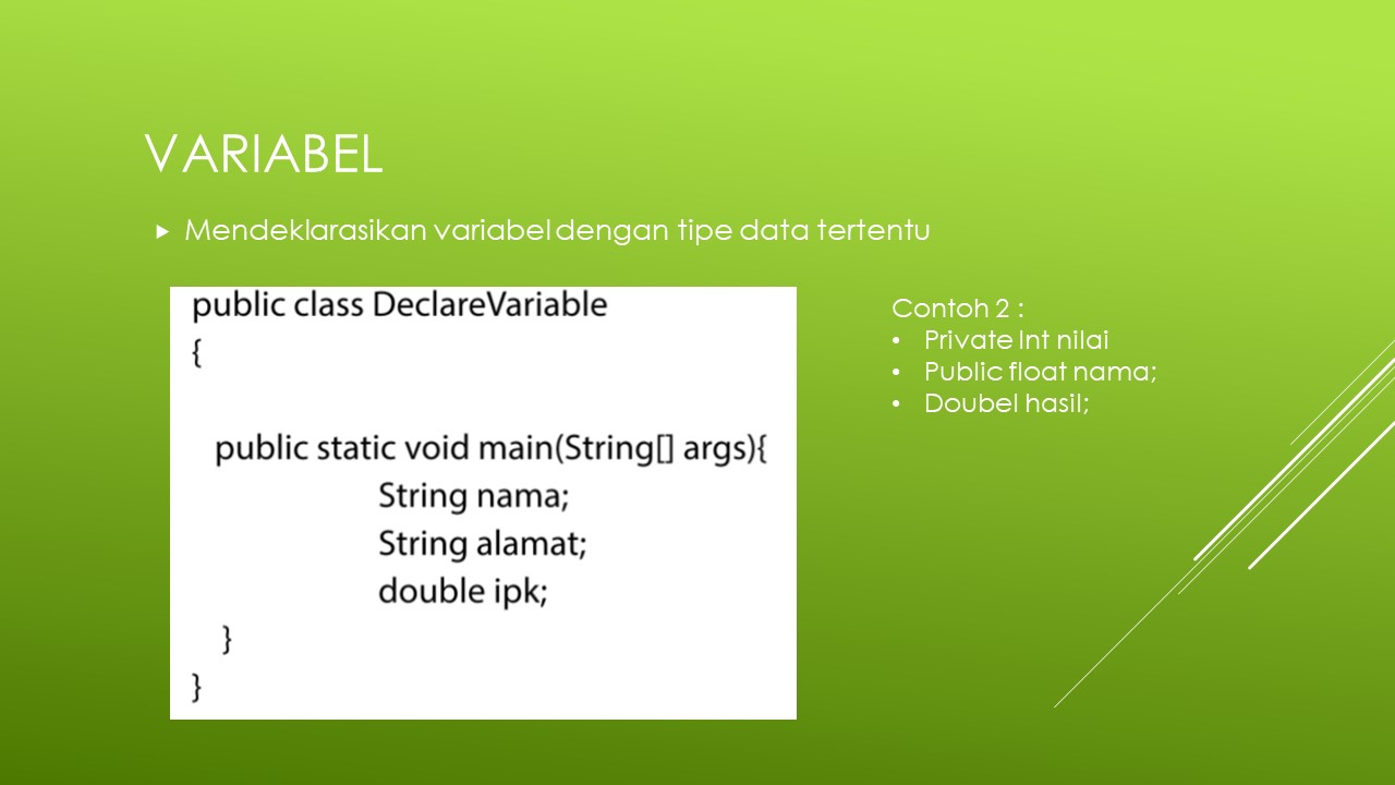 Tentu proses membuat variabel harus dideklarasikan dulu dengan suatu tipe data baik tipe data primitif ataupun tipe data reference. Selain itu pemberian nilai variable hanya boleh diisi dengan nilai yang sesuai dengan tipe data yang ditentukan.