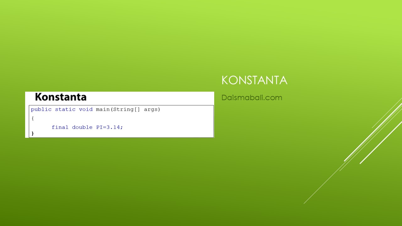 Variabel juga bisa dirubah menjadi konstanta dengan keperluan digunakan untuk menyimpan data yang tidak akan berubah. Contoh konstanta adalah phi, dalam bahasa pemrograman java, konstanta ditulis dengan menambahkan keyword final di depan tipe data sebuah variabel. Berikut gambar contoh membuat variabel konstanta :