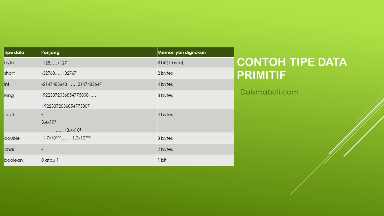 Tipe Primitve dalam tipe data yang mempunyai nilai tertentu, bukan referensi class ataupun objek.