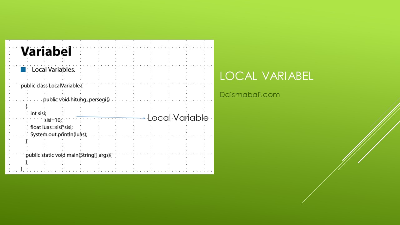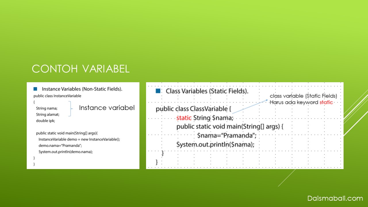Sedangkan Contoh Static Variabel merupakan variabel yang hanya bisa digunakan apabila method yang dibuat bersifat static juga. Dari 2 contoh diatas adapun contoh variabel yang bersifat local atau dengan istilah local variabel. Berikut contoh local variabel.