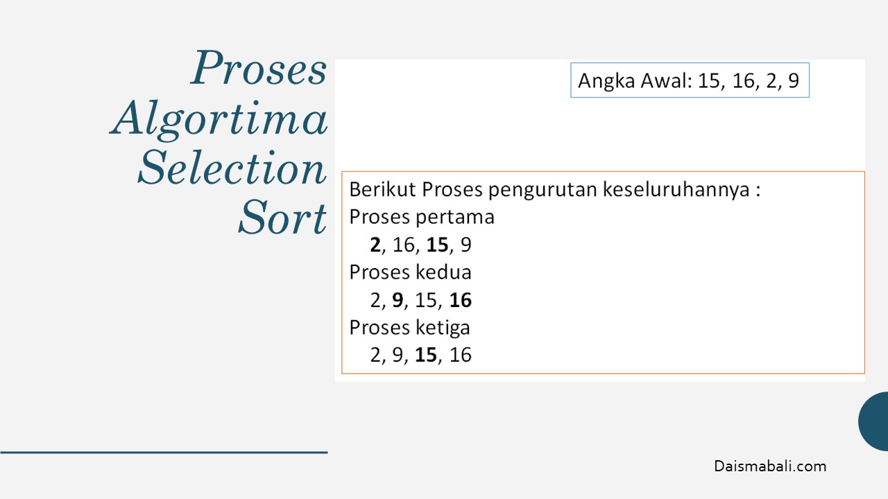 Algoritma selection sort akan memindai nilai terkecil dari suatu kumpulan data dan jika ada, data tersebut akan diletakkan pada urutan pertama. Begitu selanjutnya untuk urutan kedua dan seterusnya.
