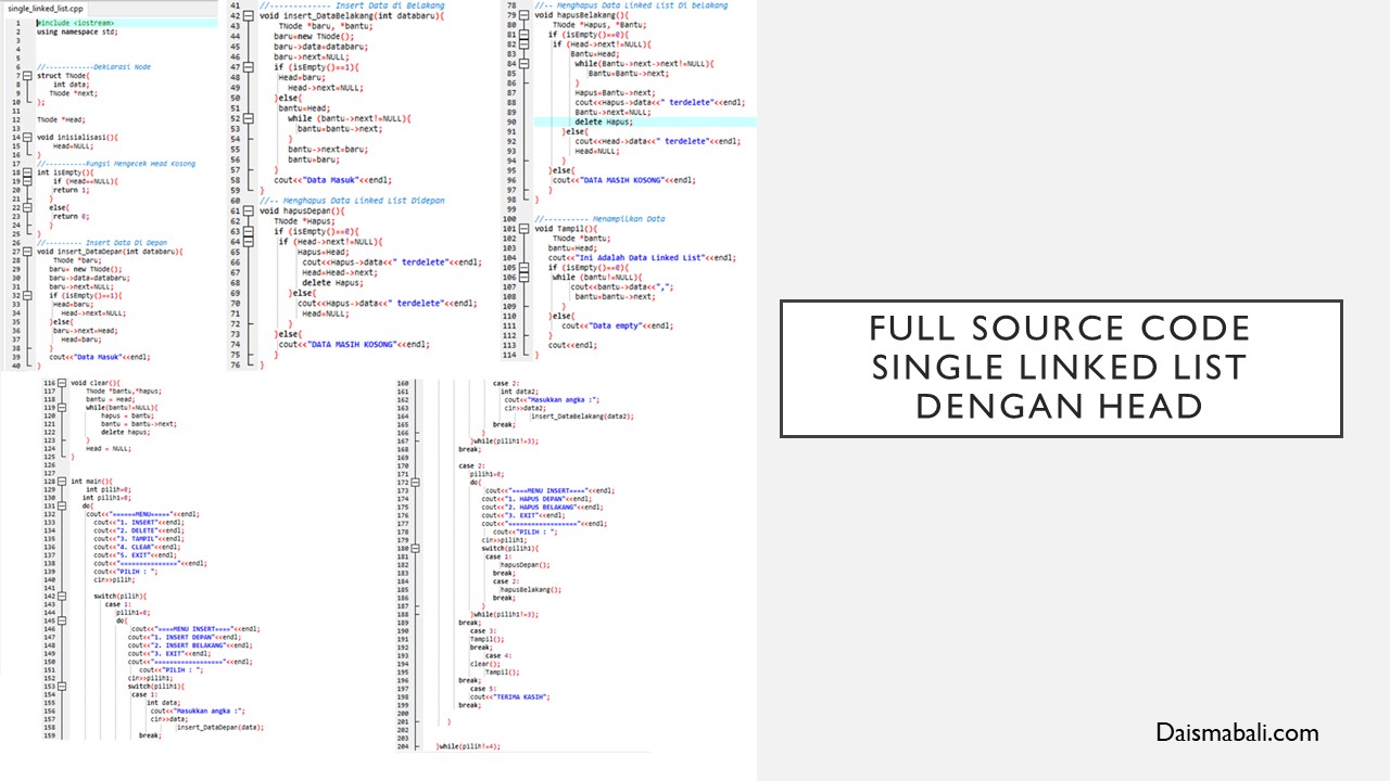 Berikut merupakan full source code Single Linked List dengan Head pada pemrograman C++ :