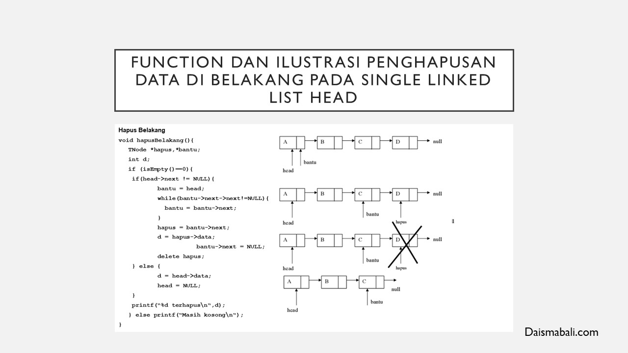 Dan berikut Function dan Ilustrasi untuk Hapus di belakang Single Linked List :