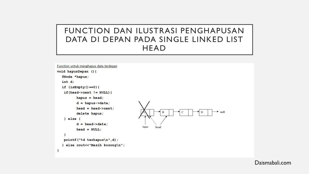 Dari ilustrasi gambar diatas dijelaskan Function di atas akan menghapus data teratas (pertama) yang ditunjuk oleh head pada linked list Penghapusan node tidak boleh dilakukan jika keadaan node sedang ditunjuk oleh pointer, maka harus dilakukan penggunakan suatu pointer lain yang digunakan untuk menunjuk node yang akan dihapus, misalnya pointer hapus dan barulah kemudian menghapus pointer hapus dengan menggunakan perintah delete. Sebelum data terdepan dihapus, head harus ditunjukkan ke node sesudahnya terlebih dahulu agar list tidak putus, sehingga node setelah head lama akan menjadi head baru (data terdepan yang baru). Jika head masih NULL maka berarti data masih kosong!