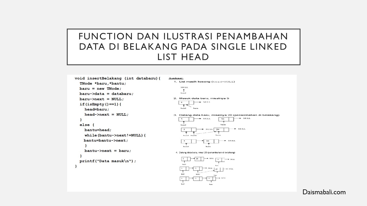- Function dan Ilustrasi Penambahan Data Di BELAKANG PADA SINGLE LINKED LIST HEAD