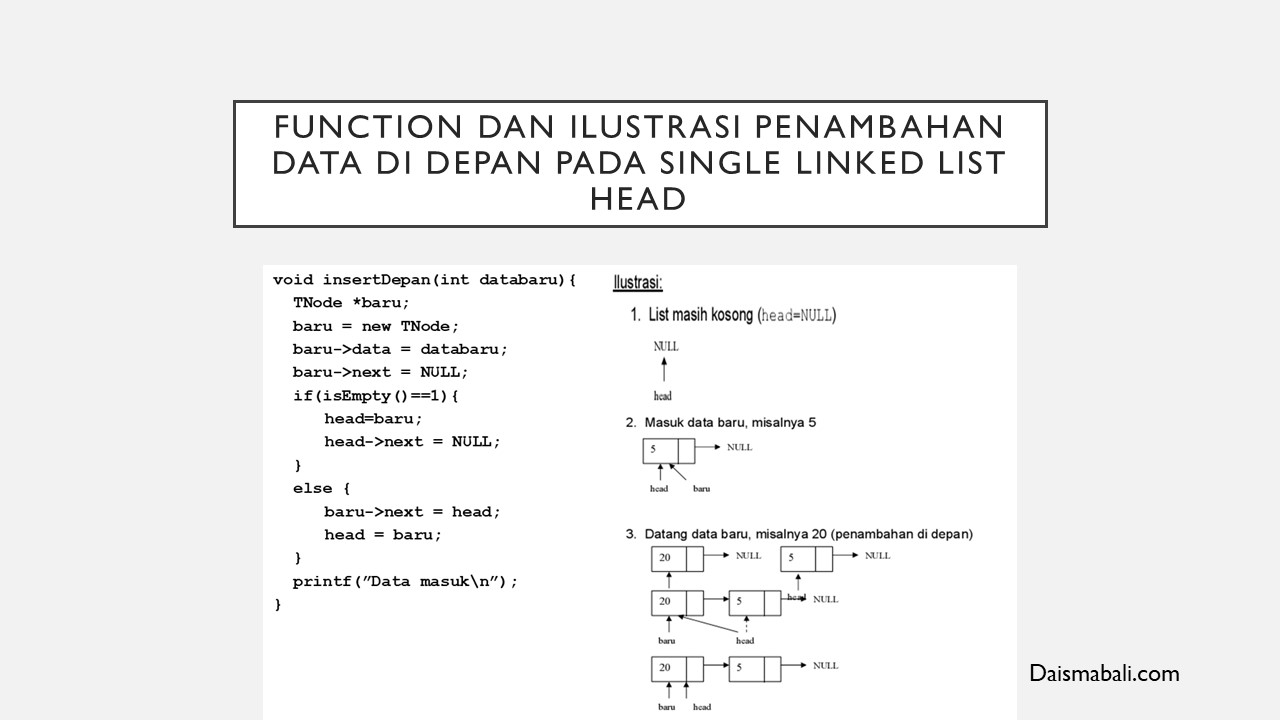 - Function dan Ilustrasi Penambahan Data Di DEPAN PADA SINGLE LINKED LIST HEAD