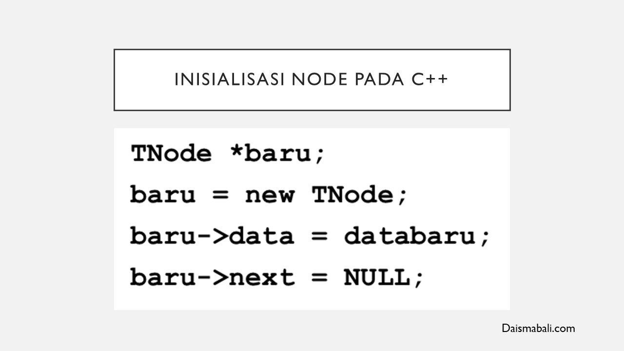 Untuk melakukan inisialisasi Node baru pada pemrograman C++ gunakan keyword new yang berarti mempersiapkan sebuah node baru berserta alokasi memorinya, kemudian node tersebut diisi data dan pointer nextnya ditunjuk ke NULL. Berikut contohnya :