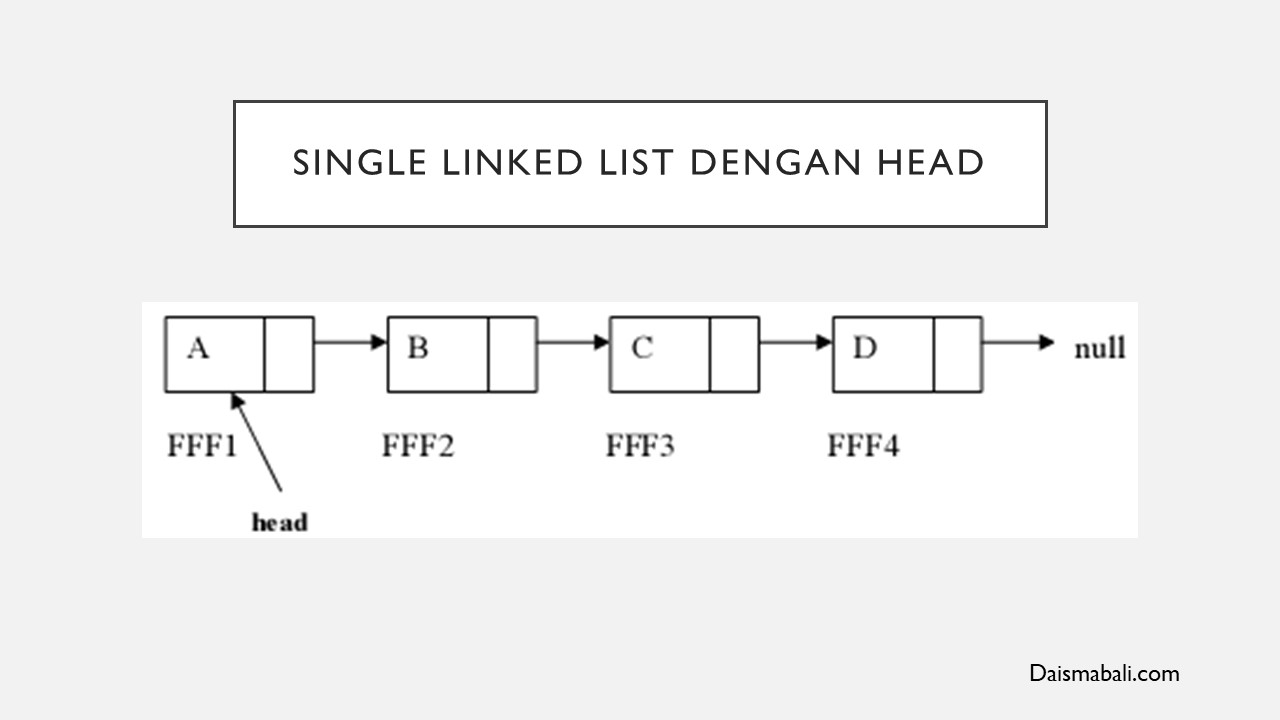Pada Single Linked List biasanya menggunakan Head. Head yang dimaksud ini adalah Kepala dari Single Linked List. Jadi dalam pemrograman diperlukan sebuah variabel pointer head untuk mebuat head Single Linked List. Head akan selalu menunjukkan Node Pertama seperti gambar berikut :