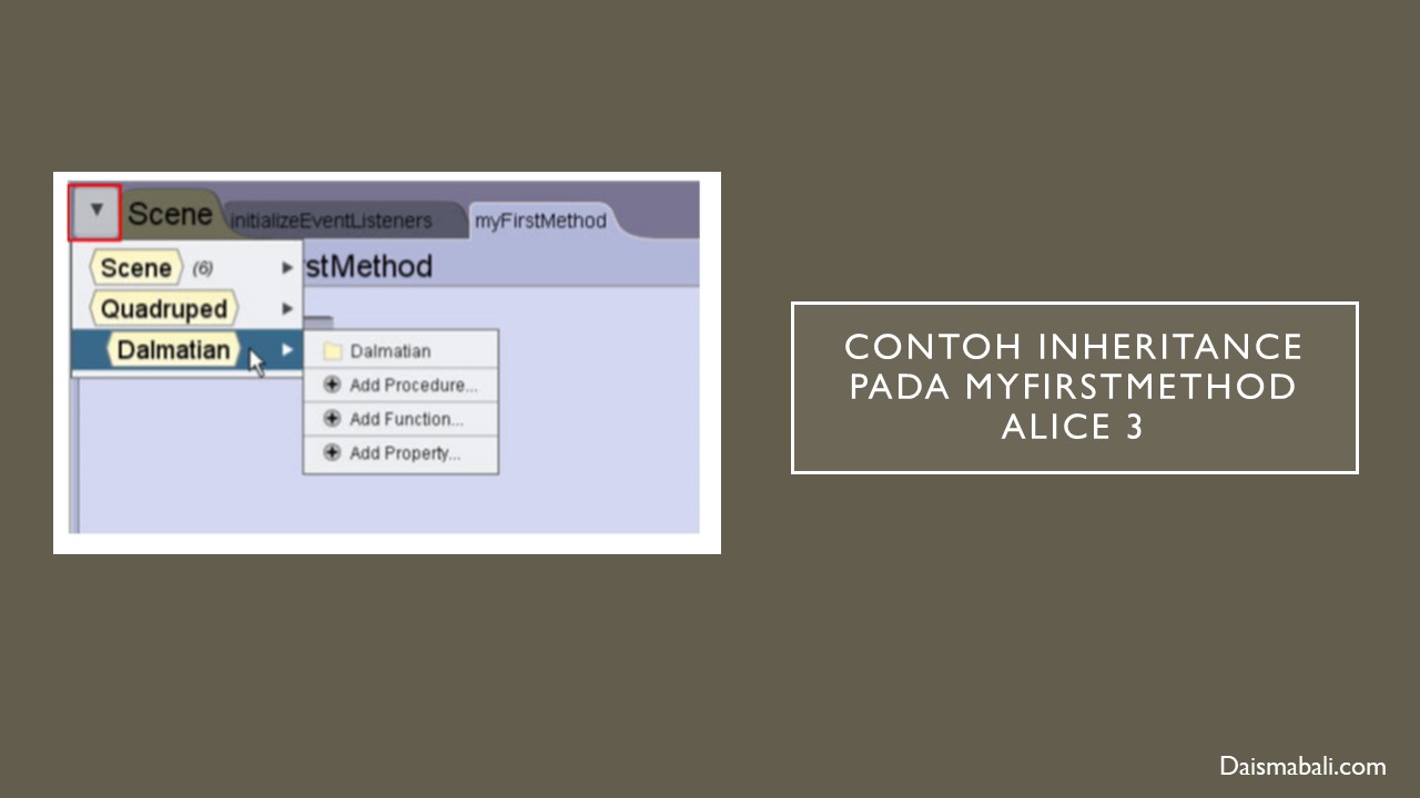Dalam Pemrograman Alice 3 sudah menerapkan Hirarki Class seperti Konsep Pewarisan. Bisa diperhatikan pada tab myFirstMethod seperti Tampilan berikut :