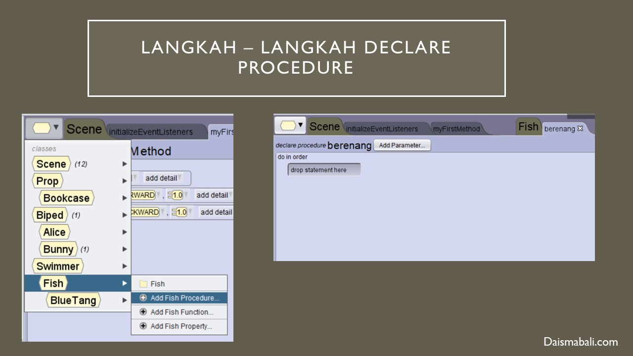 Terkait Procedures pada Pemorgraman Alice 3 Anda harus mengetahui kapan melakukan Declare Prosedur. berikut Proses Declare Prosedur yang tepat yaitu :