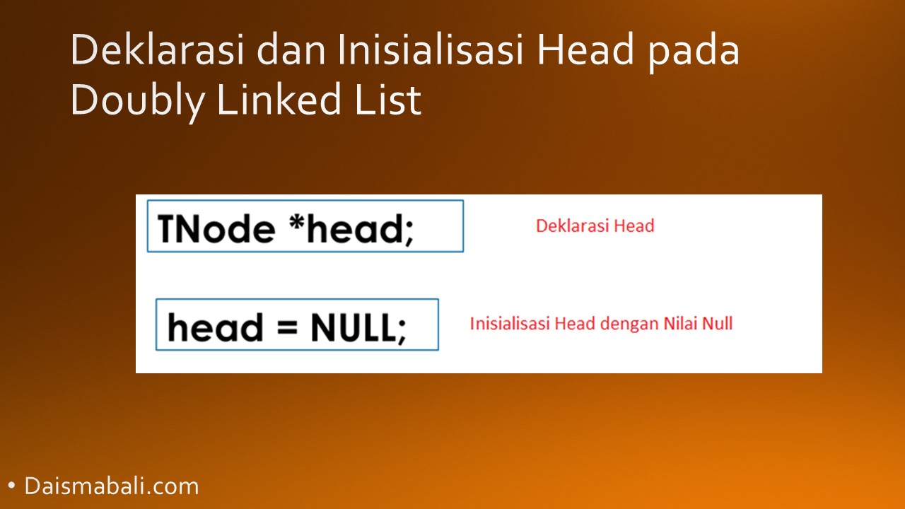 Dari potongan Code Diatas merupakan membuat Node dengan nama “baru” yang nilai pointer next dan nilai pointer prev bernilai NULL. Tentnu Setelah membuat Node anda Harus mendeklarasikan Head. Dari Deklarasi tersebut anda belum bisa secara langsung mendeklarasikan Node yang dituju sehingga pointer head harus dibuat dan bernilai Null terlebih dahulu. Untuk Deklarasi dan membuat nilai pointer Head bernilai null harus dilakukan inisialisasi seperti berikut :