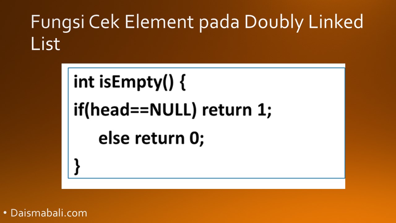 Tahap Selanjutnya penambahan pengecekan Elemen. Pengecekan elemen ini bertujuan untuk mengetahui apakah data pada double linked list sudah habis. Untuk Syntaxnya seperti berikut :
