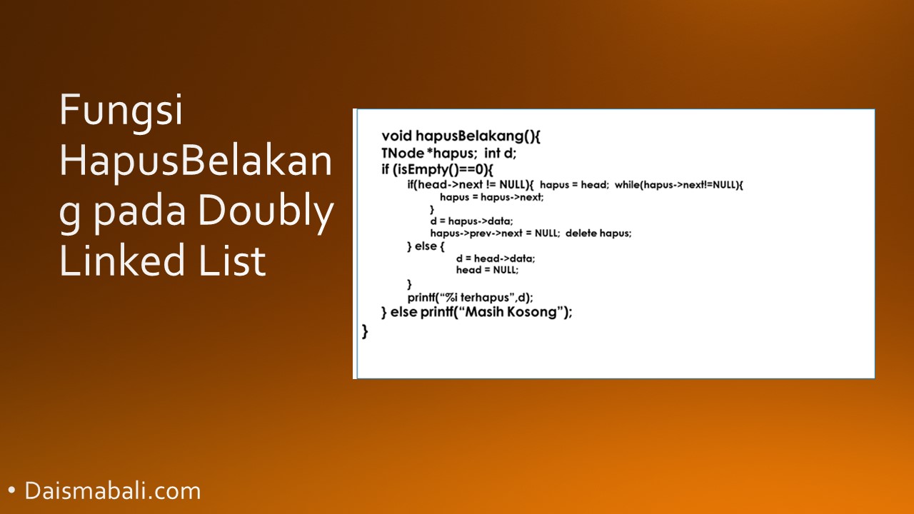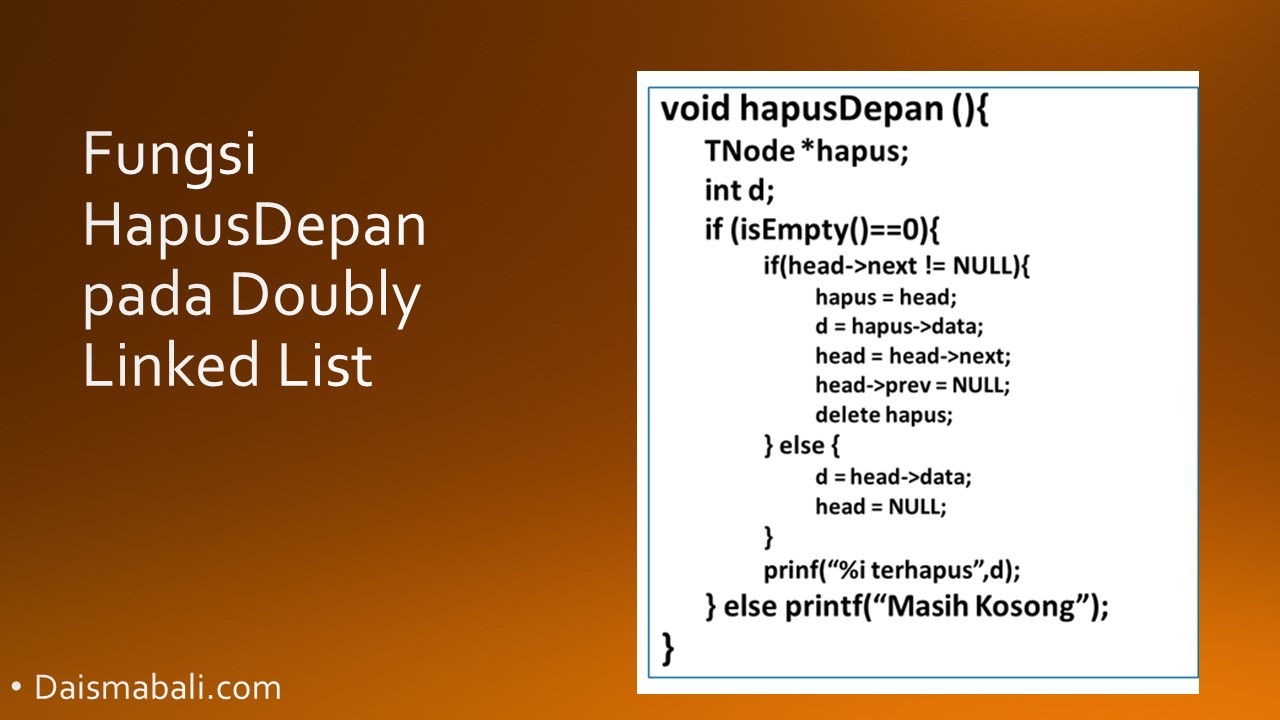Tentu Pada Setiap Penambahan Data pasti diperlukan Fungsi untuk Hapus data juga apabila data yang diinputkan salah. Dalam Doubly Linked list tambahkan Fungsi , salah satunya HapusDepan. Fungsi Hapus Depan ini adalah menghapus data yang ada posisi paling depan. Berikut Syntax Pemrograman C++ Fungsi HapusDepan dalam doubly Linked List :