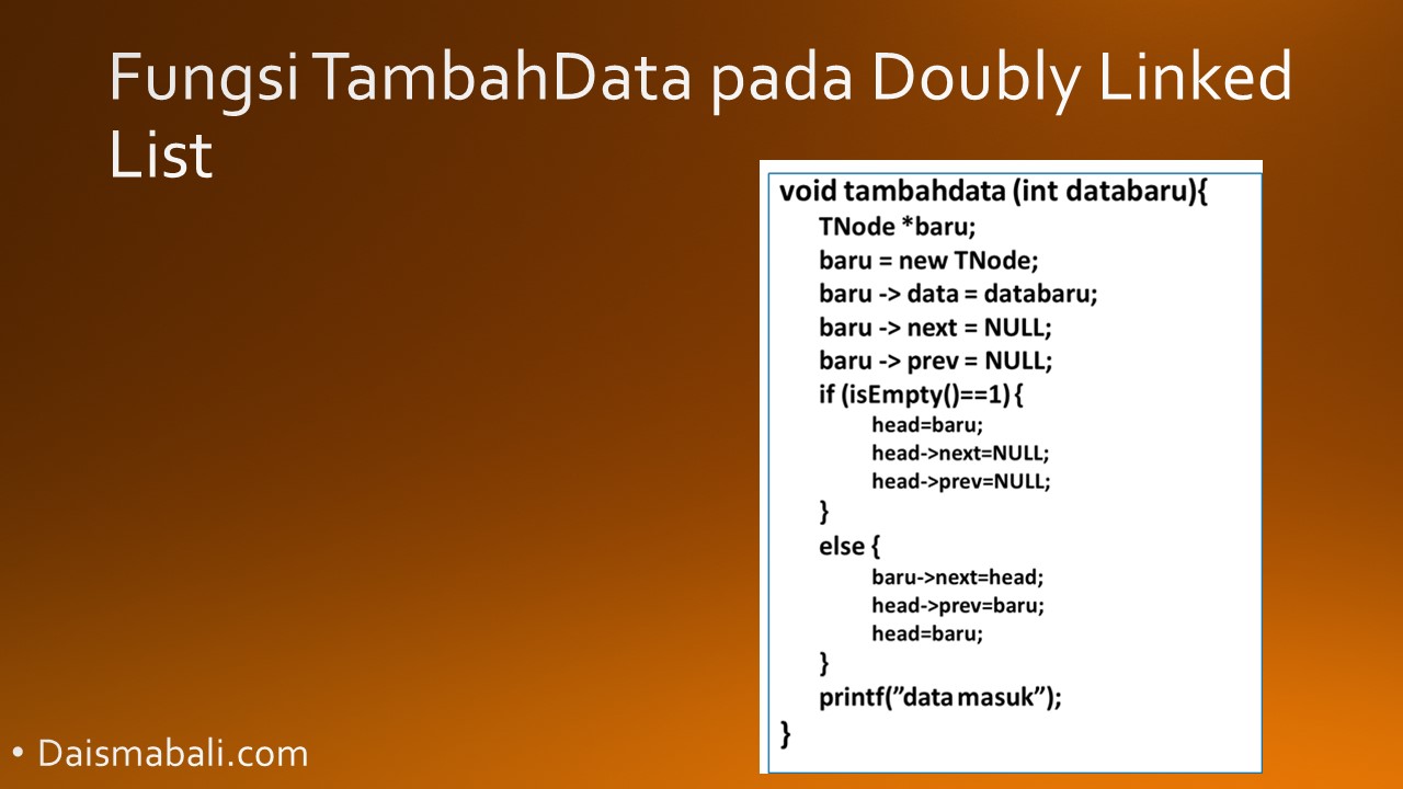 Setelah Tahapan – Tahapan yang dilakukan barulah pembuatan fungsi untuk proses tambahdata pada doubly linked List. Berikut syntax untuk melakukan tambahdata pada doubly linked List