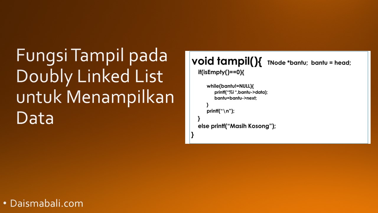 Tentunya jika ada sudah melakukan Input Data ataupun Hapus Data anda belum melihat data yang sudah tersimpan. Untuk melihatnya anda harus membuat fungsi Tampil(). Fungsi ini berguna untuk menampilkan Elemen yang sudah diinputkan ke Doubly Linked List. Berikut Syntax Tampil() dalam pemrograman C++: