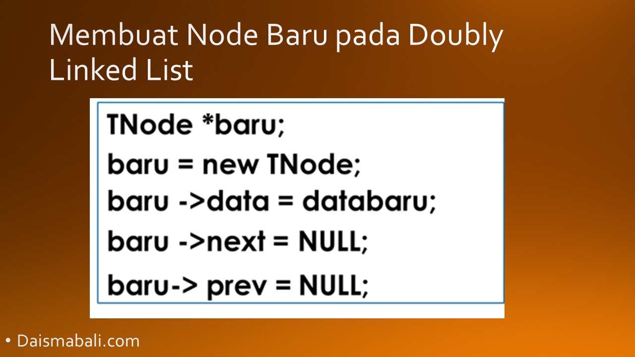 Struct Node pada Doubly Linked List terdapat Pointer Next dan pointer Prev. Setelah pembuatan Struct. Kemudian Selanjutnya yaitu pembuatan Node dengan nama “baru” yang dimana dalam bahasa pemrograman C++ menggunakan keyword new. Berikut contoh potongan codingnya :