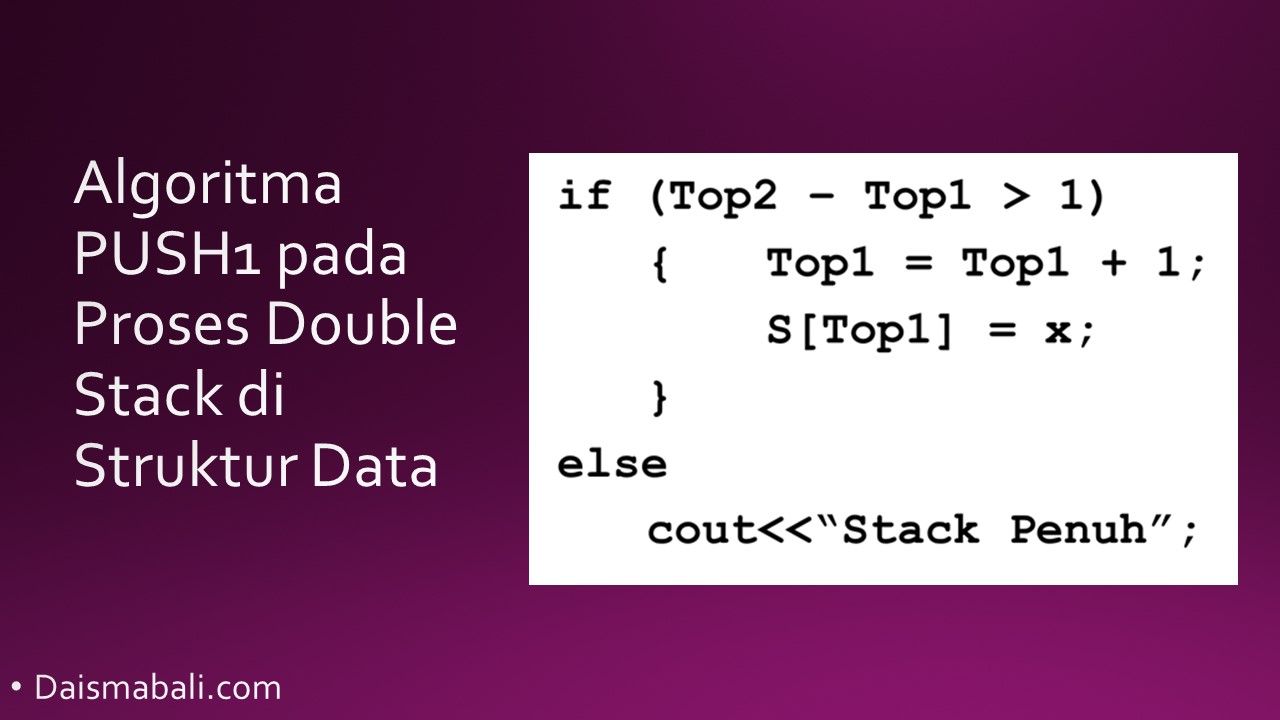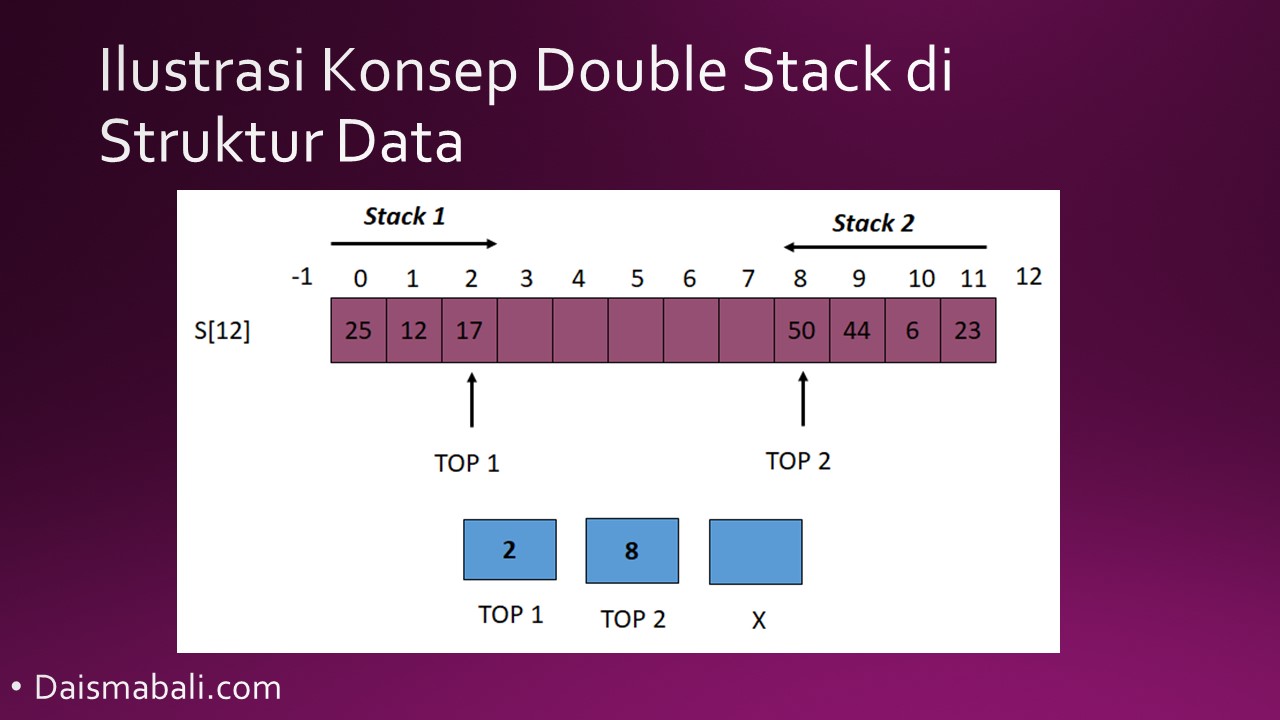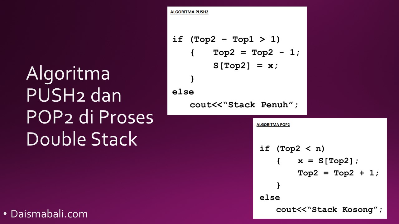 Perbedaan Antara Single Stack dengan Double Stack yaitu jumlahnya. Jadi jika menggunakan Single Stack maka untuk Prosesnya hanya 3 tahapan yaitu : Inisialisasi Awal, PUSH dan POP sedangkan yang dibahas ini adalah Double STACK yang menggunakan 2 Stack maka Otomatis ada 2 algoritma PUSH dan POP.