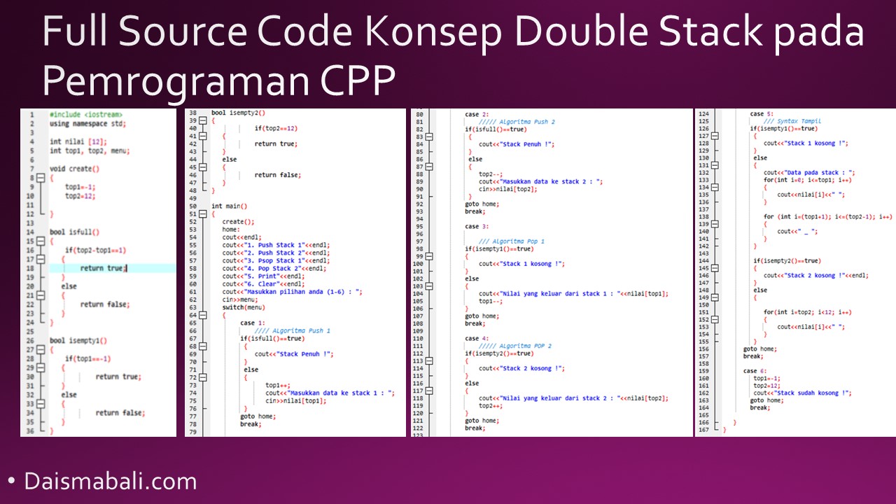 Pada Double Stack ini sudah dijelaskan Proses – Proses dan Perbedaan dengan Single Stack. Jika Diimplementasikan dalam Bahasa Pemrograman C++ dapat dibuat dengan salah satu contoh Source Code seperti berikut :