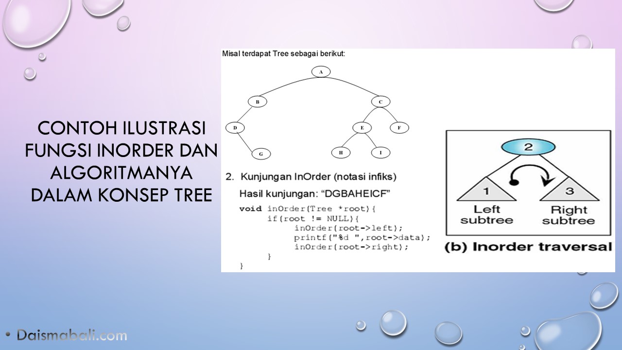 Proses Traverse yang melakukan tahapan kunjungi left node, cetak node yang dikunjungi, kunjungi right node. Berikut Ilustrasi InOrder dan Algoritma dalam Fungsi Traverse :